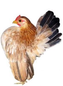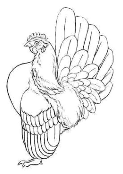 Wings: Large, long, carried vertically not quite touching the ground. May be past verticle if bird is in strut. Shoulders and Fronts: Prominently forward, slightly concealed by hackle.